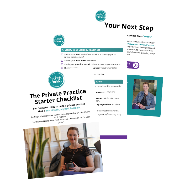Sarah Binks is a therapist, consultant, and founder of Sarah Binks Consulting, dedicated to helping therapists build private practices that are sustainable, aligned, and profitable.